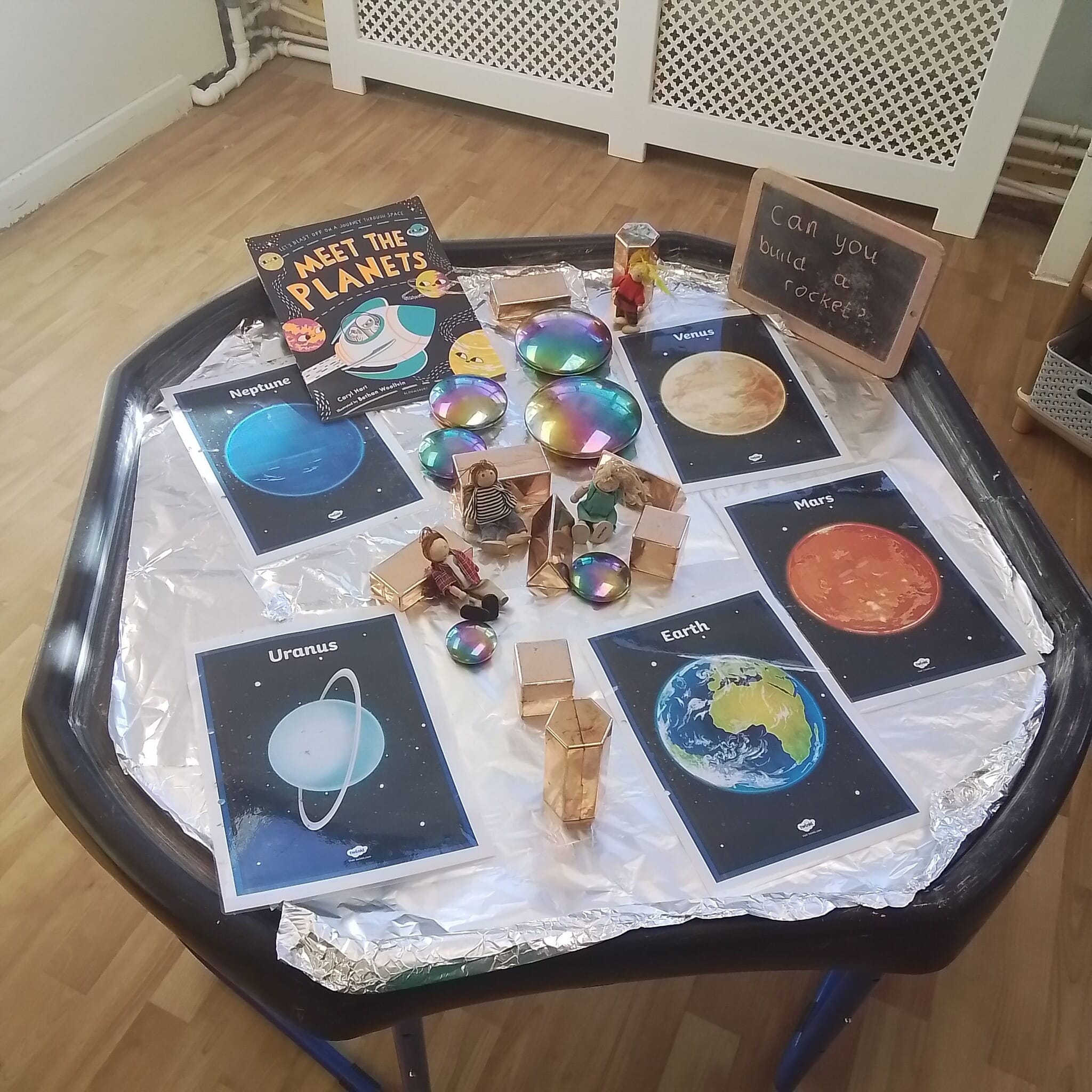 First, the children were challenged with creating a rocket. The team set out a beautiful activity tray filled with metallic 3D shapes which the children used to build their creations. The children spoke about how many shapes they had used and even included some of the small world people in their rockets, to blast off into space!