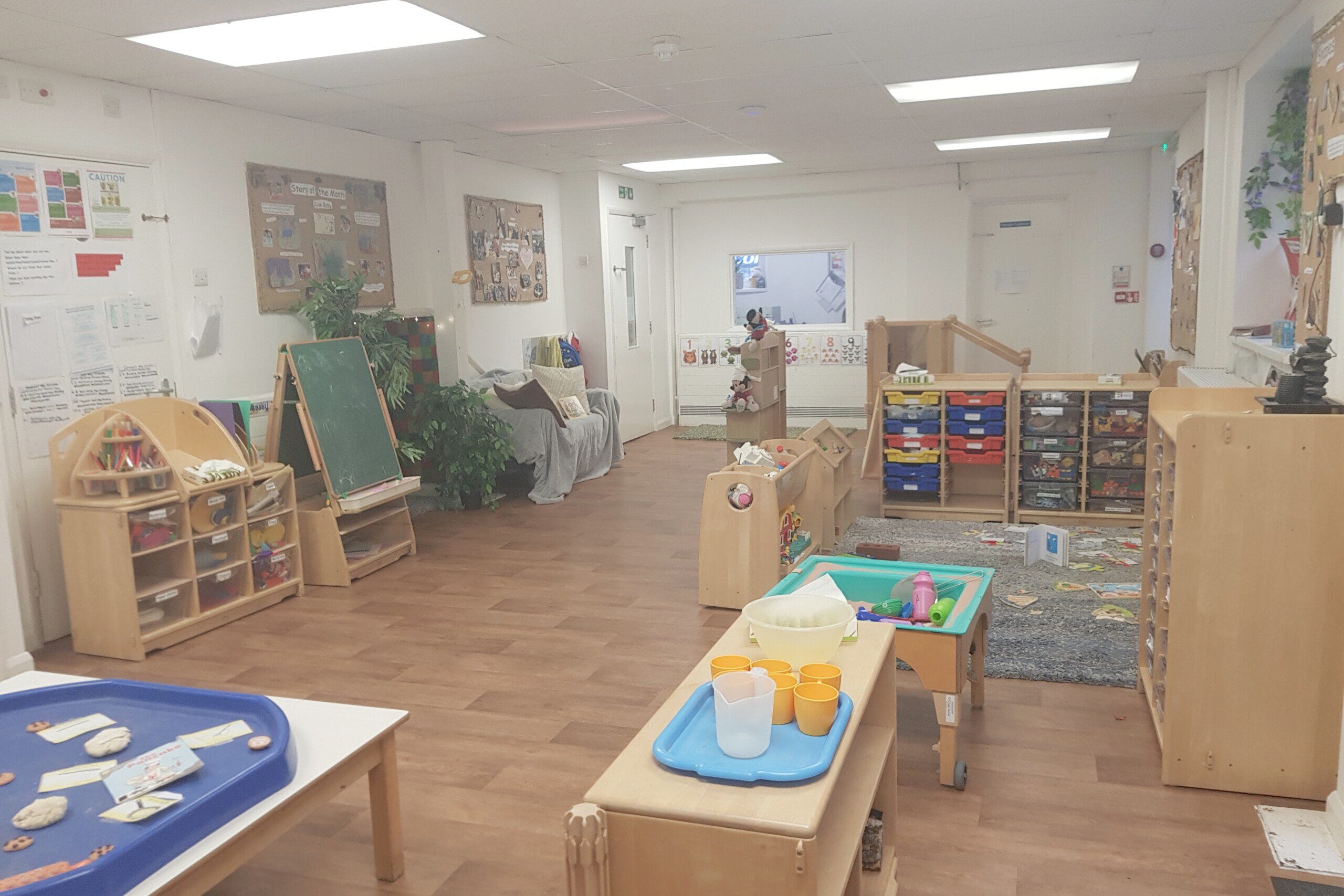 The room is carefully laid out into different areas; one side of the room is used for mealtimes, creative/messy activities and large physical activities; and the carpet area of the room is used for activities such as construction, role play and jigsaw puzzles.